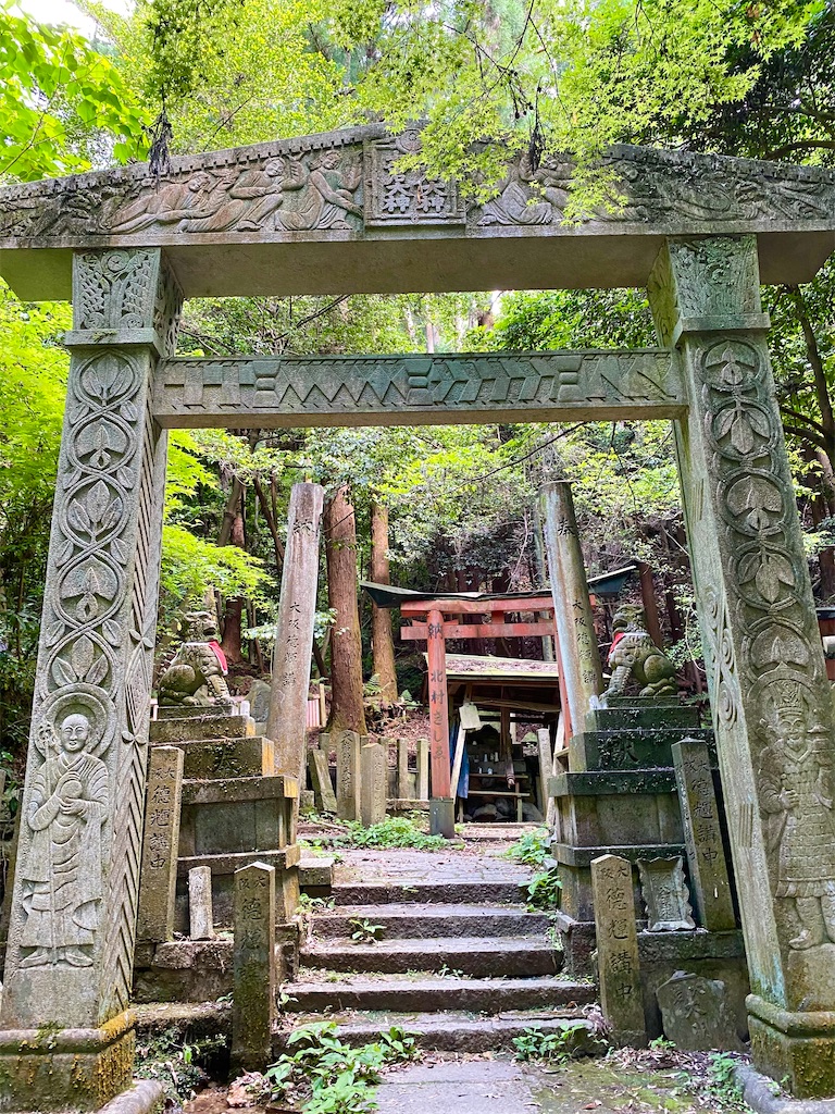 @m_c_prelude大岩神社と大岩山展望台。大岩山は深草丘陵の主峰であり、登山道は京都一周トレイルに属する。展望台までは静かな竹林の道。神社にあった鳥居はなにやら彫刻が彫られており、ちょっとコワイ。山頂からは先月歩いた乙訓から、大阪のビル群まで望め、もちろん京都盆地もよく見えた。 pic.x.com/UJqZbD4i6B